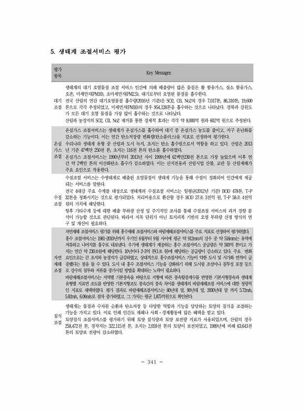 341 5. 생태계 조절서비스 평가 평가 항목 Key Messages 대기 조절 생태계의 대기 오염물질 조절 서비스 인간에 의해 배출량이 많은 물질은 황 함유가스, 질소 함유가스, 오존, 미세먼지 PM10 , 초미세먼지 PM2.5 , 대기로부터 오염된 물질을 흡수한다. 전국 산림의 연간 대기오염물질 흡수량 2016년 기준 은 SO2, O3, No2의 경우 7,017톤, 86,310톤, 19,600 톤으로 각각 추정되었고, 미세먼지 PM10 의 경우 954,128톤을 흡수하는 것으로 나타났다. 경북과 강원도 가 모든 대기 오염 물질을 가장 많이 흡수하는 것으로 나타났다. 산림과 농경지의 SO2, O3, No2 제거를 통한 경제적 효과는 각각 약 8,000억 원과 602억 원으로 추정된다. 온실 가스 조절 온실...