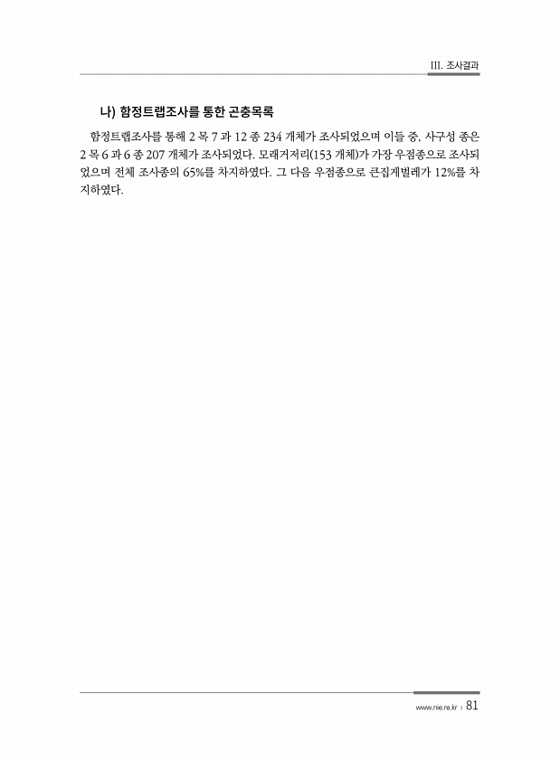 III. 조사결과 www.nie.re.kr ? 81 함정트랩조사를 통해 2 목 7 과 12 종 234 개체가 조사되었으며 이들 중, 사구성 종은 2 목 6 과 6 종 207 개체가 조사되었다. 모래거저리 153 개체 가 가장 우점종으로 조사되 었으며 전체 조사종의 65%를 차지하였다. 그 다음 우점종으로 큰집게벌레가 12%를 차지하였다.