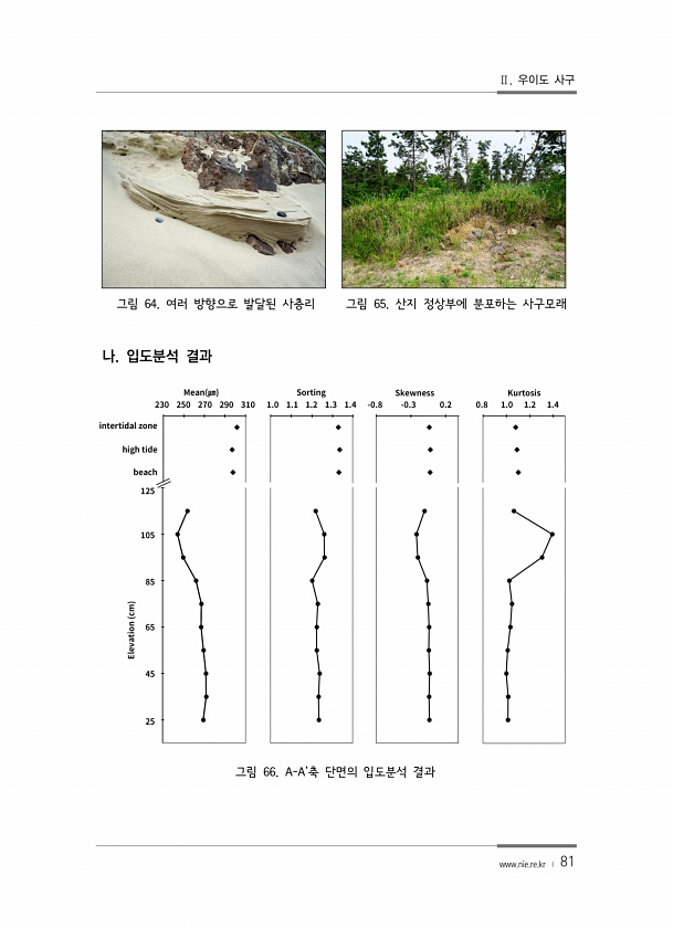 Ⅱ. 우이도 사구 www.nie.re.kr ? 81 그림 64. 여러 방향으로 발달된 사층리 그림 65. 산지 정상부에 분포하는 사구모래 나. 입도분석 결과 그림 66. A-A’축 단면의 입도분석결과