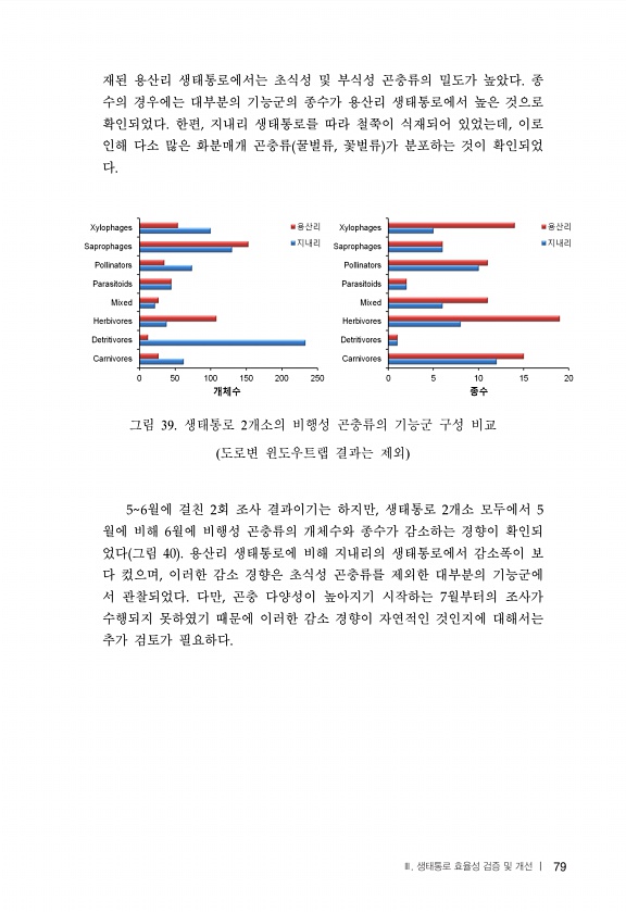 79 재된 용산리 생태통로에서는 초식성 및 부식성 곤충류의 밀도가 높았다 종 수의 경우에는 대부분의 기능군의 종수가 용산리 생태통로에서 높은 것으로 확인되었다 한편 지내리 생태통로를 따라 철쭉이 식재되어 있었는데 이로 인해 다소 많은 화분매개 곤충류 꿀벌류 꽃벌류 가 분포하는 것이 확인되었 다 그림 39. 생태통로 2개소의 비행성 곤충류의 기능군 구성 비교 도로변 윈도우트랩 결과는 제외 월에 걸친 회 조사 결과이기는 하지만 생태통로 개소 모두에서 월에 비해 월에 비행성 곤충류의 개체수와 종수가 감소하는 경향이 확인되 었다 그림 용산리 생태통로에 비해 지내리의 생태통로에서 감소폭이 보 다 컸으며 이러한 감소 경향은 초식성 곤충류를 제외한 대부분의 기능군에 서 관찰되었다 다만 곤충 다양성이 높아지기 시작하는 월...