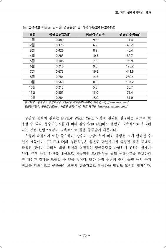 Ⅲ. 지역 생태계서비스 평가 75 월별 평균유량 CMS 평균강우일수 평균강수량 ㎜ 1월 0.480 9.5 11.4 2월 0.378 6.2 43.2 3월 0.426 8.2 40.4 4월 0.285 10.3 82.7 5월 0.106 7.8 96.9 6월 0.216 9.0 175.2 7월 0.678 16.8 441.8 8월 0.784 14.5 260.4 9월 0.560 8.0 107.2 10월 0.215 5.5 50.7 11월 0.301 13.0 75.4 12월 0.284 15.0 31.0 평균유량 충청남도 수질측정망 모니터링 자료 20112014 재가공, http//www.werec.re.kr/ 평균강우일수, 평균강수량 ㎜ 서천군 통계서비스 자료 재가공, http//stat.seocheon.go.kr/ [표 Ⅲ...