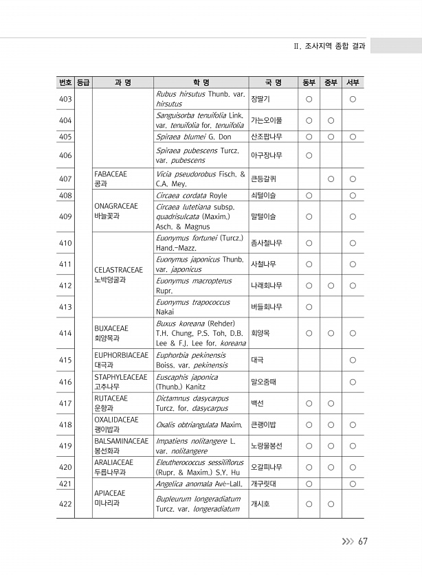 Ⅱ. 조사지역 종합 결과 67 번호 등급 과 명 학 명 국 명 동부 중부 서부 403 Rubus hirsutus Thunb. var. hirsutus 장딸기 ○ ○ 404 Sanguisorba tenuifolia Link. var. tenuifolia for. tenuifolia 가는오이풀 ○ ○ 405 Spiraea blumei G. Don 산조팝나무 ○ ○ ○ 406 Spiraea pubescens Turcz. var. pubescens 아구장나무 ○ 407 FABACEAE 콩과 Vicia pseudorobus Fisch. & C.A. Mey. 큰등갈퀴 ○ ○ 408 ONAGRACEAE 바늘꽃과 Circaea cordata Royle 쇠털이슬 ○ ○ 409 Circaea lutetiana subsp. q...