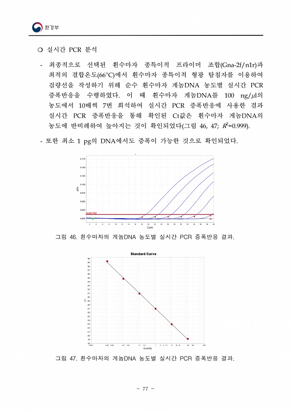77 ? 실시간 PCR 분석 최종적으로 선택된 흰수마자 종특이적 프라이머 조합 Gna-2f/n1r 과 최적의 결합온도 66°C 에서 흰수마자 종특이적 형광 탐침자를 이용하여 검량선을 작성하기 위해 순수 흰수마자 게놈DNA 농도별 실시간 PCR 증폭반응을 수행하였다. 이 때 흰수마자 게놈DNA를 100 ng/?l의 농도에서 10배씩 7번 희석하여 실시간 PCR 증폭반응에 사용한 결과 실시간 PCR 증폭반응을 통해 확인된 Ct값은 흰수마자 게놈DNA의 농도에 반비례하여 높아지는 것이 확인되었다 그림 46, 47; R2=0.999 또한 최소 1 pg의 DNA에서도 증폭이 가능한 것으로 확인되었다. 그림 46. 흰수마자의 게놈DNA 농도별 실시간 PCR 증폭반응 결과. 그림 47. 흰수마자의 게놈DNA 농도별 실시...