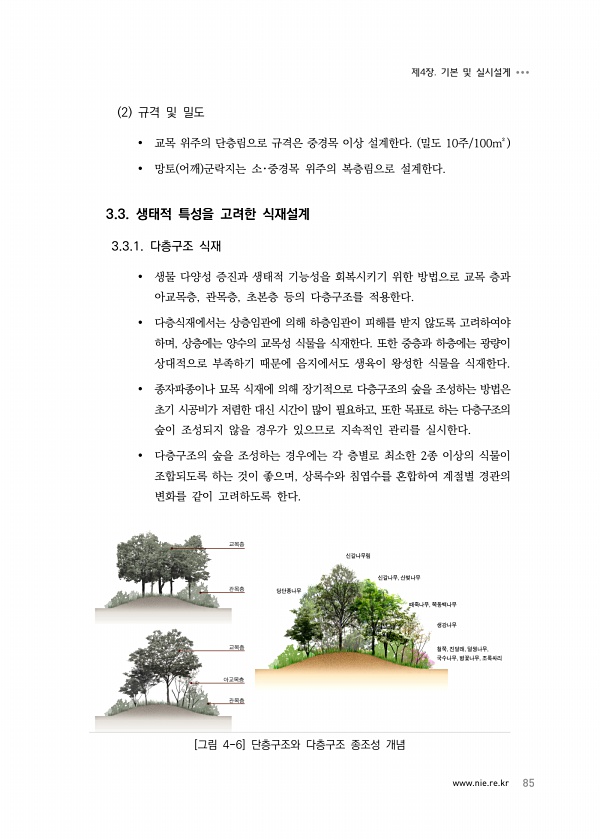 www.nie.re.kr 85 제4장. 기본 및 실시설계 2 규격 및 밀도 교목 위주의 단층림으로 규격은 중경목 이상 설계한다. 밀도 10주/100m² 망토 어깨 군락지는 소?중경목 위주의 복층림으로 설계한다. 3.3. 생태적 특성을 고려한 식재설계 3.3.1. 다층구조 식재 생물 다양성 증진과 생태적 기능성을 회복시키기 위한 방법으로 교목 층과 아교목층, 관목층, 초본층 등의 다층구조를 적용한다. 다층식재에서는 상층임관에 의해 하층임관이 피해를 받지 않도록 고려하여야 하며, 상층에는 양수의 교목성 식물을 식재한다. 또한 중층과 하층에는 광량이 상대적으로 부족하기 때문에 음지에서도 생육이 왕성한 식물을 식재한다. 종자파종이나 묘목 식재에 의해 장기적으로 다층구조의 숲을 조성하는 방법은 초기 시공비가 저렴한 ...