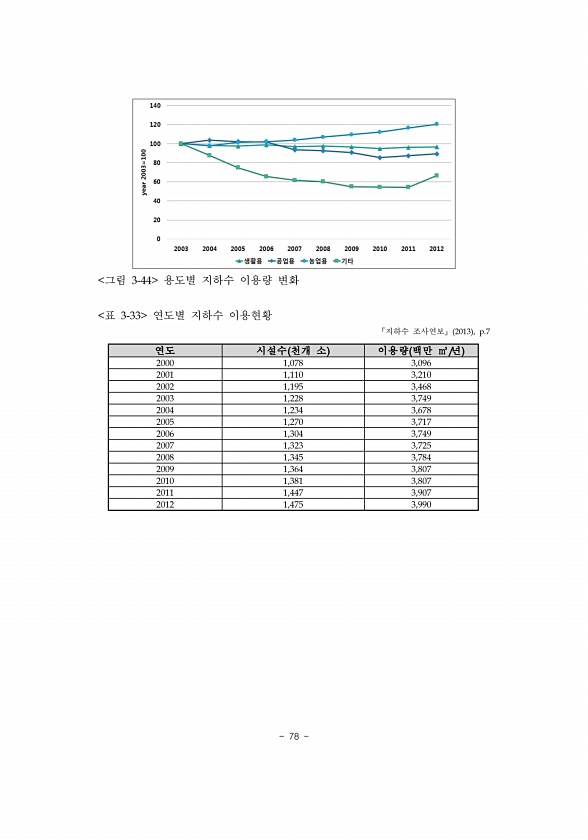 78 그림 3-44 용도별 지하수 이용량 변화 표 3-33 연도별 지하수 이용현황 『지하수 조사연보』 2013 , p.7 연도 시설수 천개 소 이용량 백만 ㎥/년 2000 1,078 3,096 2001 1,110 3,210 2002 1,195 3,468 2003 1,228 3,749 2004 1,234 3,678 2005 1,270 3,717 2006 1,304 3,749 2007 1,323 3,725 2008 1,345 3,784 2009 1,364 3,807 2010 1,381 3,807 2011 1,447 3,907 2012 1,4753,990