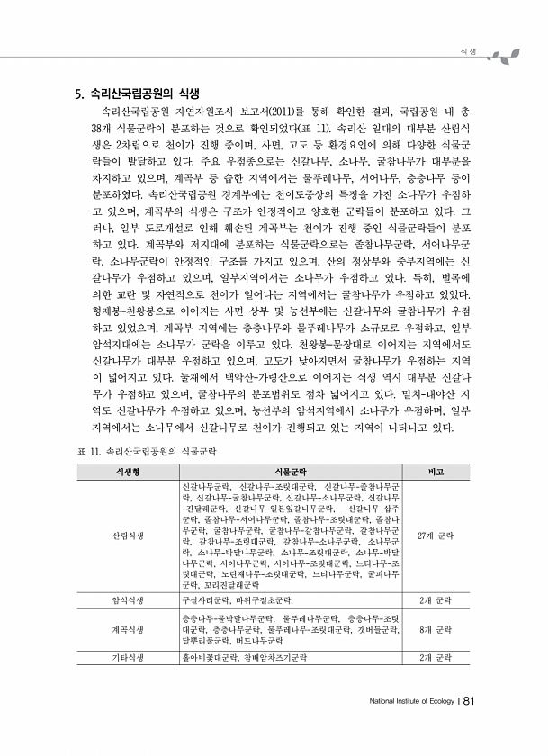 식 생 National Institute of EcologyⅠ81 식생형 식물군락 비고 산림식생 신갈나무군락, 신갈나무-조릿대군락, 신갈나무-졸참나무군 락, 신갈나무-굴참나무군락, 신갈나무-소나무군락, 신갈나무 -진달래군락, 신갈나무-일본잎갈나무군락, 신갈나무-삽주 군락, 졸참나무-서어나무군락, 졸참나무-조릿대군락, 졸참나 무군락, 굴참나무군락, 굴참나무-갈참나무군락, 갈참나무군 락, 갈참나무-조릿대군락, 갈참나무-소나무군락, 소나무군 락, 소나무-박달나무군락, 소나무-조릿대군락, 소나무-박달 나무군락, 서어나무군락, 서어나무-조릿대군락, 느티나무-조 릿대군락, 노린재나무-조릿대군락, 느티나무군락, 굴피나무 군락, 꼬리진달래군락 27개 군락 암석식생 구실사리군락, 바위구절초군락, 2개 군락 계곡식생 층층나무...