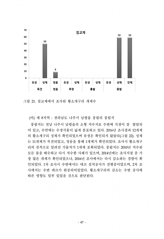 67 그림 21. 침교제에서 조사된 황소개구리 개체수 아 제 8지역 전라남도 나주시 남평읍 풍림리 풍림지 풍림지는 전남 나주시 남평읍의 소형 저수지로 수변에 식생이 잘 발달되 어 있고, 수면에는 수생식물이 넓게 분포하고 있다. 2016년 조사결과 12개체 의 황소개구리 성체가 확인되었으며 유생은 확인되지 않았다 그림 22 성체 는 11개체가 목견되었고, 청음을 통해 1개체가 확인되었다. 조사시 황소개구 리의 천적으로 알려진 가물치가 1개체 포획되었다. 풍림지는 2010년 저수된 모든 물을 배수하고 다시 저수한 사례가 있으며, 2014년에는 조사지점 중 가 장 많은 개체가 확인되었으나, 2016년 조사에서는 다시 감소하는 경향이 확 인되었다. 1차 조사시 수변에서는 데크 설치공사가 진행중이었으며, 2차 조 사...