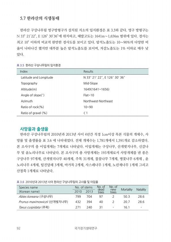 92 국가장기생태연구 사망율과 출생율 한라산 구상나무림의 2010년과 2013년 사이 4년간 직경 1cm이상 목본 식물의 개체수, 사 망률 및 출생률을 표 3.6 에 나타내었다. 전체 개체수는 1,781개에서 1,591개로 감소하였다. 본 조사구의 총 이입개체는 7개체로 나타났다. 이입개체는 구상나무, 산개벚지나무, 신갈나 무 및 윤노리나무로 나타났다. 본 조사구의 총 사망개체는 193개체로서 사망개체를 낸 종은 구상나무 97개체, 산개벚지나무 40개체, 주목 31개체, 물참나무 7개체, 병꽃나무 6개체 , 윤 노리나무 4개체, 털진달래 3개체, 마가목 2개체, 사스래나무 1개체, 노린재나무 1개체 그리고 산철쭉 1개체로 나타났다. Index Results Latitude and Longitude N 33°...
