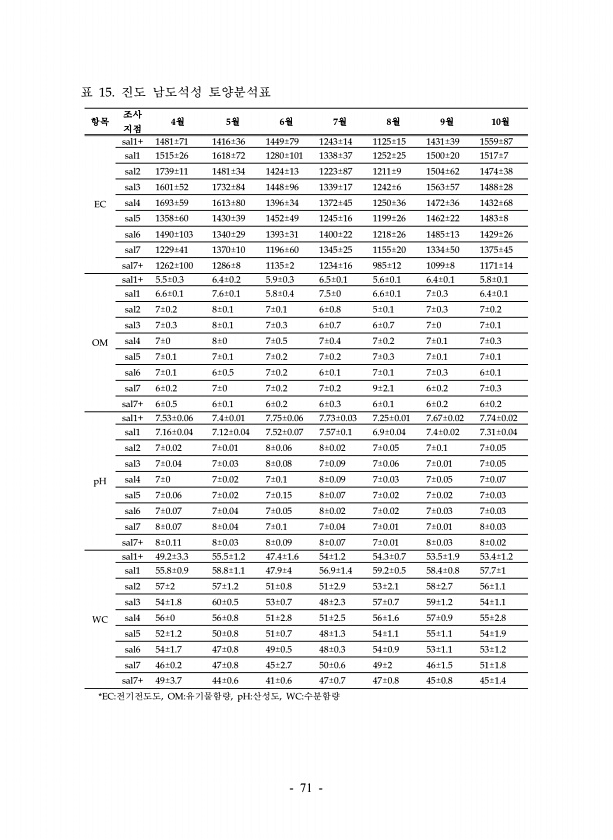 71 항목 조사 지점 4월 5월 6월 7월 8월 9월 10월 EC sal1+ 1481±71 1416±36 1449±79 1243±14 1125±15 1431±39 1559±87 sal1 1515±26 1618±72 1280±101 1338±37 1252±25 1500±20 1517±7 sal2 1739±11 1481±34 1424±13 1223±87 1211±9 1504±62 1474±38 sal3 1601±52 1732±84 1448±96 1339±17 1242±6 1563±57 1488±28 sal4 1693±59 1613±80 1396±34 1372±45 1250±36 1472±36 1432±68 sal5 1358±60 1430±39 1452±49 1245±16 1199±26 1462±22 1483±8...