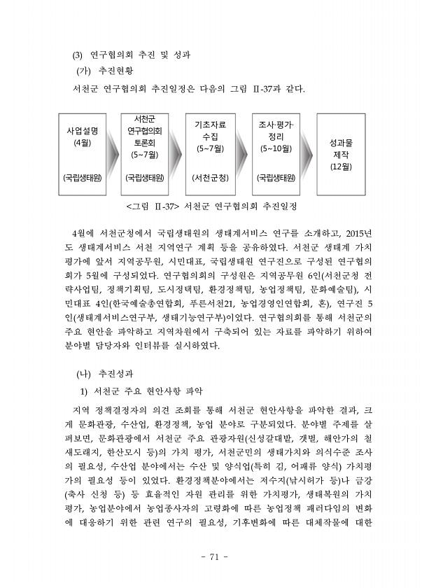 71 연구협의회 추진 및 성과 가 추진현황 서천군 연구협의회 추진일정은 다음의 그림 과 같다 사업설명 4월 서천군 연구협의회 토론회 57월 기초자료 수집 57월 조사·평가· 정리 510월 성과물 제작 12월 국립생태원 국립생태원 서천군청 국립생태원 그림 서천군 연구협의회 추진일정 월에 서천군청에서 국립생태원의 생태계서비스 연구를 소개하고 년 도 생태계서비스 서천 지역연구 계획 등을 공유하였다 서천군 생태계 가치 평가에 앞서 지역공무원 시민대표 국립생태원 연구진으로 구성된 연구협의 회가 월에 구성되었다 연구협의회의 구성원은 지역공무원 인 서천군청 전 략사업팀 정책기획팀 도시정택팀 환경정책팀 농업정책팀 문화예술팀 시 민대표 인 한국예술총연합회 푸른서천 농업경영인연합회 혼 연구진 인 생태계서비스연구부 생태기능연구...