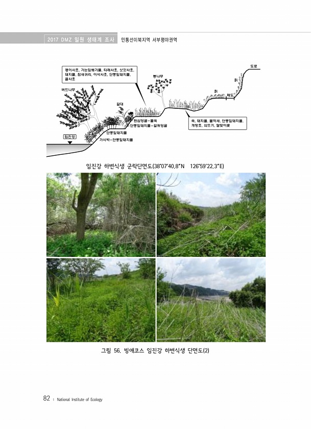 2017 DMZ 일원 생태계 조사 민통선이북지역 서부평야권역 82 ? National Institute of Ecology 임진강 하변식생 군락단면도 38°07′40.8″N 126°59′22.3″E 그림 56. 빙애코스 임진강 하변식생 단면도 2