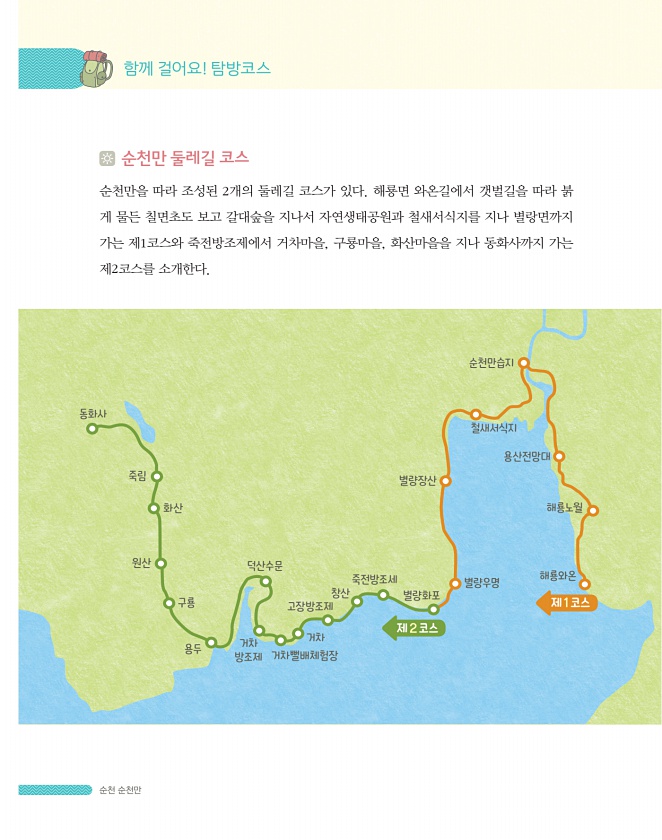 순천 순천만 순천만 둘레길 코스 순천만을 따라 조성된 2개의 둘레길 코스가 있다. 해룡면 와온길에서 갯벌길을 따라 붉 게 물든 칠면초도 보고 갈대숲을 지나서 자연생태공원과 철새서식지를 지나 별랑면까지 가는 제1코스와 죽전방조제에서 거차마을, 구룡마을, 화산마을을 지나 동화사까지 가는 제2코스를 소개한다. 제1코스 제2코스 동화사 죽림 원산 용두 화산 덕산수문 거차뻘배체험장 거차 고장방조제 창산 죽전방조세 별량화포 별량우명 별량장산 철새서식지 순천만습지 용산전망대 해룡와온 해룡노월 거차 방조제구룡