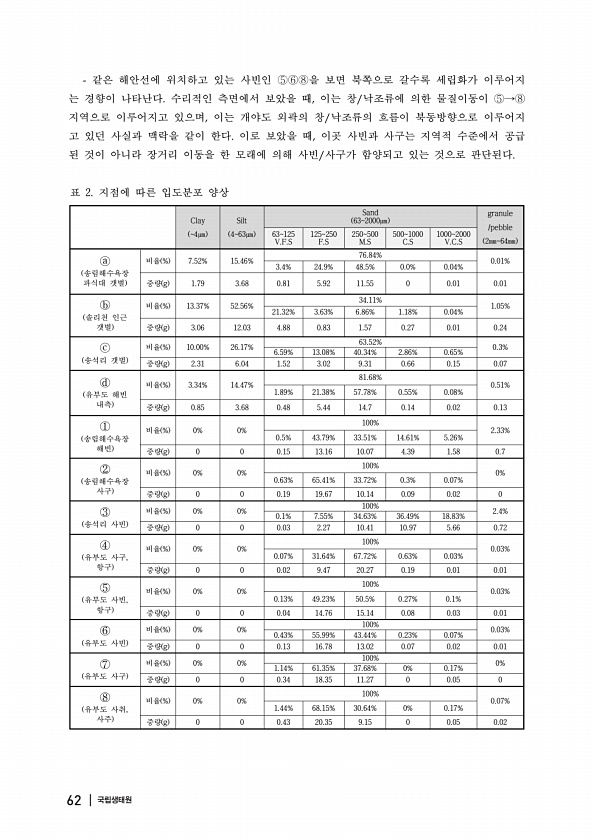 같은 해안선에 위치하고 있는 사빈인 을 보면 북쪽으로 갈수록 세립화가 이루어지 는 경향이 나타난다 수리적인 측면에서 보았을 때 이는 창 낙조류에 의한 물질이동이 지역으로 이루어지고 있으며 이는 개야도 외곽의 창 낙조류의 흐름이 북동방향으로 이루어지 고 있던 사실과 맥락을 같이 한다 이로 보았을 때 이곳 사빈과 사구는 지역적 수준에서 공급 된 것이 아니라 장거리 이동을 한 모래에 의해 사빈 사구가 함양되고 있는 것으로 판단된다 Clay 4㎛ Silt 463㎛ Sand 632000㎛ granule /pebble 2㎜64㎜ 63125 V.F.S 125250 F.S 250500 M.S 5001000 C.S 10002000 V.C.S ⓐ 송림해수욕장 파식대 갯벌 비율 % 7.52% 15.46% 76.84% 0.01%...