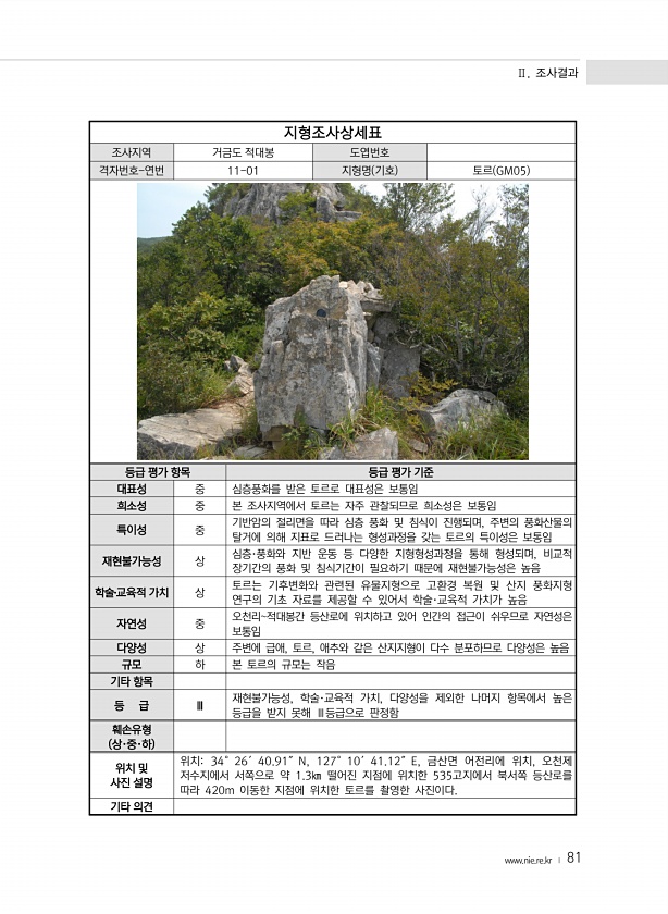 Ⅱ. 조사결과 www.nie.re.kr ? 81 지형조사상세표 조사지역 거금도 적대봉 도엽번호 격자번호-연번 11-01 지형명 기호 토르 GM05 등급 평가 항목 등급 평가 기준 대표성 중 심층풍화를 받은 토르로 대표성은 보통임 희소성 중 본 조사지역에서 토르는 자주 관찰되므로 희소성은 보통임 특이성 중 기반암의 절리면을 따라 심층 풍화 및 침식이 진행되며, 주변의 풍화산물의 탈거에 의해 지표로 드러나는 형성과정을 갖는 토르의 특이성은 보통임 재현불가능성 상 심층·풍화와 지반 운동 등 다양한 지형형성과정을 통해 형성되며, 비교적 장기간의 풍화 및 침식기간이 필요하기 때문에 재현불가능성은 높음 학술?교육적 가치 상 토르는 기후변화와 관련된 유물지형으로 고환경 복원 및 산지 풍화지형 연구의 기초 자료를 제공할 ...