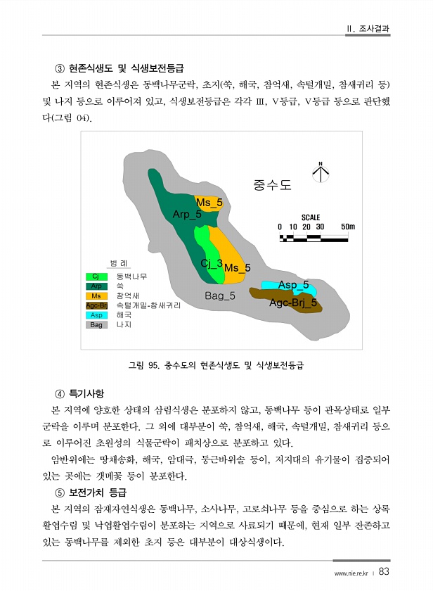 Ⅱ. 조사결과 www.nie.re.kr ? 83 ③ 현존식생도 및 식생보전등급 본 지역의 현존식생은 동백나무군락, 초지 쑥, 해국, 참억새, 속털개밀, 참새귀리 등 및 나지 등으로 이루어져 있고, 식생보전등급은 각각 Ⅲ, Ⅴ등급, Ⅴ등급 등으로 판단했 다 그림 04 그림 95. 중수도의 현존식생도 및 식생보전등급 ④ 특기사항 본 지역에 양호한 상태의 삼림식생은 분포하지 않고, 동백나무 등이 관목상태로 일부 군락을 이루며 분포한다. 그 외에 대부분이 쑥, 참억새, 해국, 속털개밀, 참새귀리 등으 로 이루어진 초원성의 식물군락이 패치상으로 분포하고 있다. 암반위에는 땅채송화, 해국, 암대극, 둥근바위솔 등이, 저지대의 유기물이 집중되어 있는 곳에는 갯메꽃 등이 분포한다. ⑤ 보전가치 등급 본 지역의 잠재자연식생...