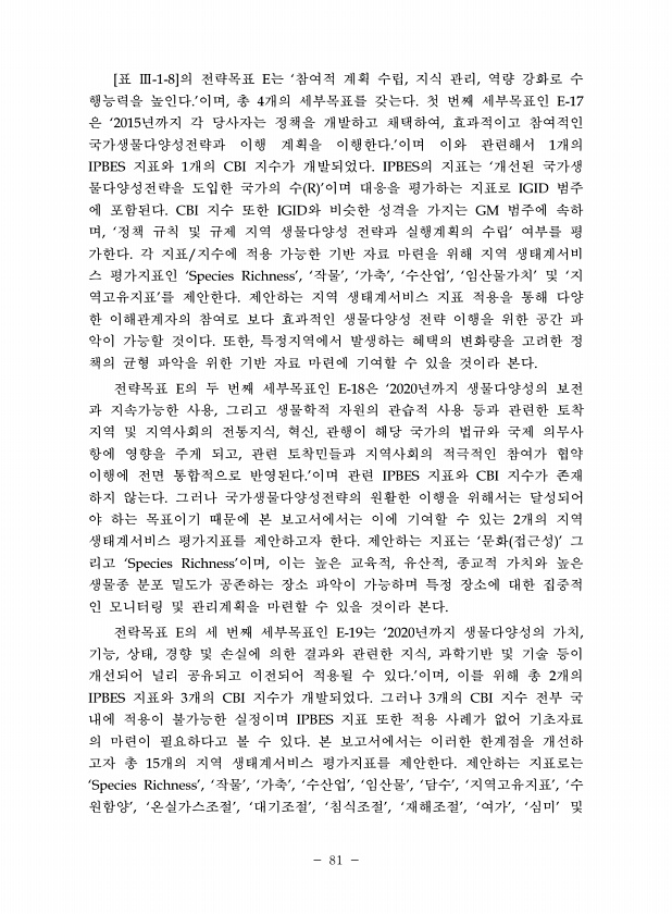 81 [표 Ⅲ-1-8]의 전략목표 E는 ‘참여적 계획 수립, 지식 관리, 역량 강화로 수 행능력을 높인다.’이며, 총 4개의 세부목표를 갖는다. 첫 번째 세부목표인 E-17 은 ‘2015년까지 각 당사자는 정책을 개발하고 채택하여, 효과적이고 참여적인 국가생물다양성전략과 이행 계획을 이행한다.’이며 이와 관련해서 1개의 IPBES 지표와 1개의 CBI 지수가 개발되었다. IPBES의 지표는 ‘개선된 국가생 물다양성전략을 도입한 국가의 수 R ’이며 대응을 평가하는 지표로 IGID 범주 에 포함된다. CBI 지수 또한 IGID와 비슷한 성격을 가지는 GM 범주에 속하 며, ‘정책 규칙 및 규제 지역 생물다양성 전략과 실행계획의 수립’ 여부를 평 가한다. 각 지표/지수에 적용 가능한 기반 자료 마련을 위해 지역...