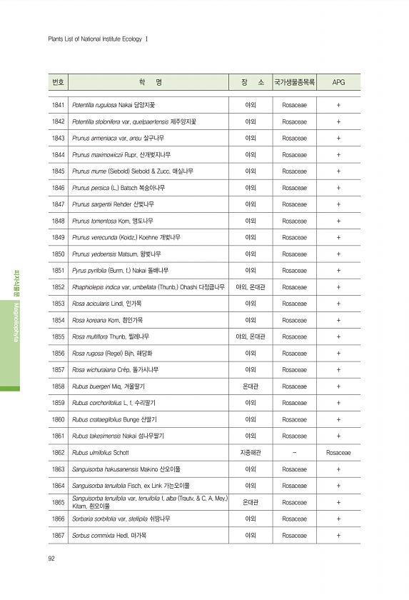 92 번호 학 명 장 소 국가생물종목록 APG 피자식물문 Magnoliophyta Plants List of National Institute Ecology Ⅰ 1841 Potentilla rugulosa Nakai 당양지꽃 야외 Rosaceae + 1842 Potentilla stolonifera var. quelpaertensis 제주양지꽃 야외 Rosaceae + 1843 Prunus armeniaca var. ansu 살구나무 야외 Rosaceae + 1844 Prunus maximowiczii Rupr. 산개벚지나무 야외 Rosaceae + 1845 Prunus mume Siebold Siebold & Zucc. 매실나무 야외 Rosaceae + 1846 Prunus persica L. Batsch...
