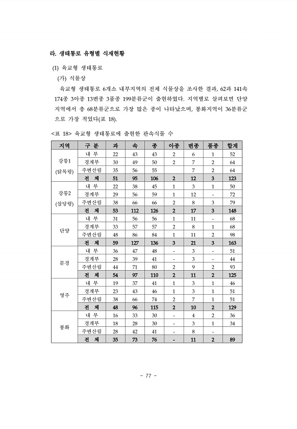 77 라. 생태통로 유형별 식재현황 1 육교형 생태통로 가 식물상 육교형 생태통로 6개소 내부지역의 전체 식물상을 조사한 결과, 62과 141속 174종 3아종 13변종 3품종 199분류군이 출현하였다. 지역별로 살펴보면 단양 지역에서 총 68분류군으로 가장 많은 종이 나타났으며, 봉화지역이 36분류군 으로 가장 적었다 표 18 지역 구 분 과 속 종 아종 변종 품종 합계 강릉1 닭목령 내 부 22 43 43 2 6 1 52 경계부 30 49 50 2 7 2 64 주변산림 35 56 55 7 2 64 전 체 51 95 106 2 12 3 123 강릉2 삽당령 내 부 22 38 45 1 3 1 50 경계부 29 56 59 1 12 72 주변산림 38 66 66 2 8 3 79 전 체 53 112 126 2 1...