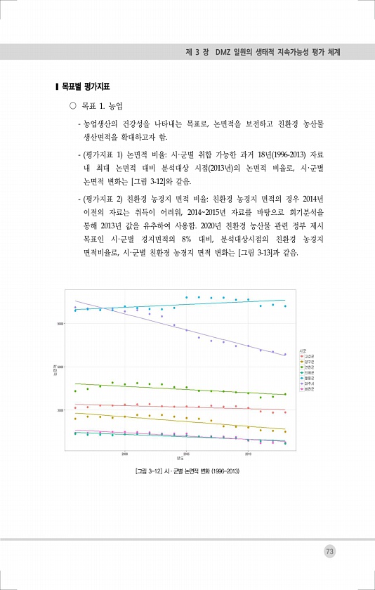 73 제 3 장 DMZ 일원의 생태적 지속가능성 평가 체계 ?목표별 평가지표 ○ 목표 1. 농업 농업생산의 건강성을 나타내는 목표로, 논면적을 보전하고 친환경 농산물 생산면적을 확대하고자 함. 평가지표 1 논면적 비율시·군별 취합 가능한 과거 18년 1996-2013 자료 내 최대 논면적 대비 분석대상 시점 2013년 의 논면적 비율로, 시·군별 논면적 변화는 [그림 3-12]와 같음. 평가지표 2 친환경 농경지 면적 비율친환경 농경지 면적의 경우 2014년 이전의 자료는 취득이 어려워, 20142015년 자료를 바탕으로 회기분석을 통해 2013년 값을 유추하여 사용함. 2020년 친환경 농산물 관련 정부 제시 목표인 시·군별 경지면적의 8% 대비, 분석대상시점의 친환경 농경지 면적비율로, 시·군별 친환경 ...