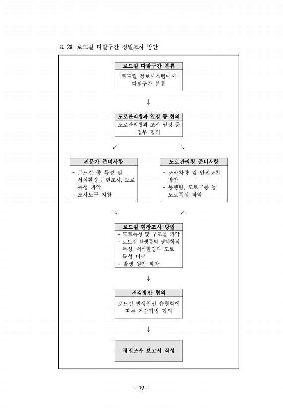 79 로드킬 다발구간 분류 로드킬 정보시스템에서 다발구간 분류 ↓ 도로관리청과 일정 등 협의 도로관리청과 조사 일정 등 업무 협의 ↙ ↘ 전문가 준비사항 도로관리청 준비사항 로드킬 종 특성 및 서식환경 문헌조사, 도로 특성 파악 조사도구 지참 조사차량 및 안전조치 방안 통행량, 도로구종 등 도로특성 파악 ↘ ↙ 로드킬 현장조사 방법 도로특성 및 구조물 파악 로드킬 발생종의 생태학적 특성, 서식환경과 도로 특성 비교 발생 원인 파악 ↓ 저감방안 협의 로드킬 발생원인 유형화에 따른 저감기법 협의 ↓ 정밀조사 보고서 작성 표 28. 로드킬 다발구간 정밀조사방안