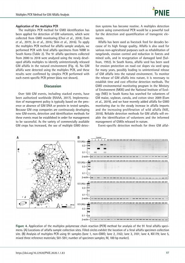 Multiplex PCR Method for GM Alfalfa Analysis https//doi.org/10.22920/PNIE.2020.1.1.83 87 Application of the multiplex PCR The multiplex PCR method for GMO identification has been applied for detection of GM volunteers, which were collected from GMO monitoring Choi et al., 2018; Eum et al., 2019; Jo et al., 2016; Shin et al., 2016 To apply the multiplex PCR method for alfalfa sample analysis, we pe...