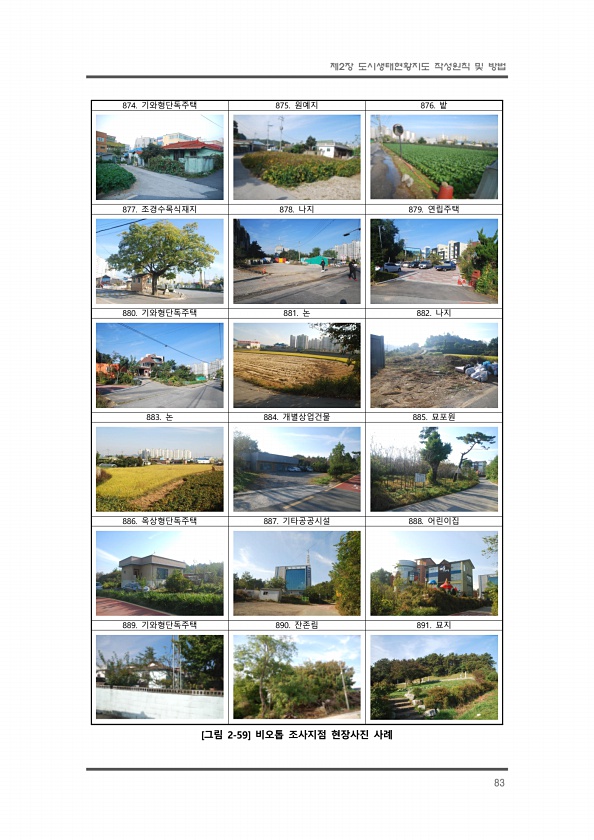 제2장 도시생태현황지도 작성원칙 및 방법 83 874. 기와형단독주택 875. 원예지 876. 밭 877. 조경수목식재지 878. 나지 879. 연립주택 880. 기와형단독주택 881. 논 882. 나지 883. 논 884. 개별상업건물 885. 묘포원 886. 옥상형단독주택 887. 기타공공시설 888. 어린이집 889. 기와형단독주택 890. 잔존림 891. 묘지 [그림 2-59] 비오톱 조사지점 현장사진사례