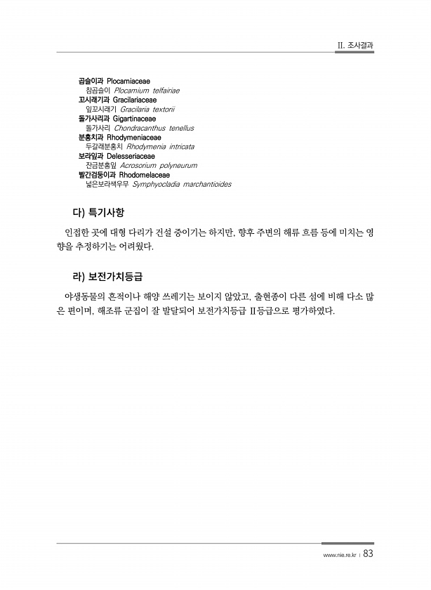 II. 조사결과 www.nie.re.kr ? 83 곱슬이과 Plocamiaceae 참곱슬이 Plocamium telfairiae 꼬시래기과 Gracilariaceae 잎꼬시래기 Gracilaria textorii 돌가사리과 Gigartinaceae 돌가사리 Chondracanthus tenellus 분홍치과 Rhodymeniaceae 두갈래분홍치 Rhodymenia intricata 보라잎과 Delesseriaceae 잔금분홍잎 Acrosorium polyneurum 빨간검둥이과 Rhodomelaceae 넓은보라색우무 Symphyocladia marchantioides 인접한 곳에 대형 다리가 건설 중이기는 하지만, 향후 주변의 해류 흐름 등에 미치는 영 향을 추정하기는 어려웠다. 야생동물의 흔적이나 해양 ...