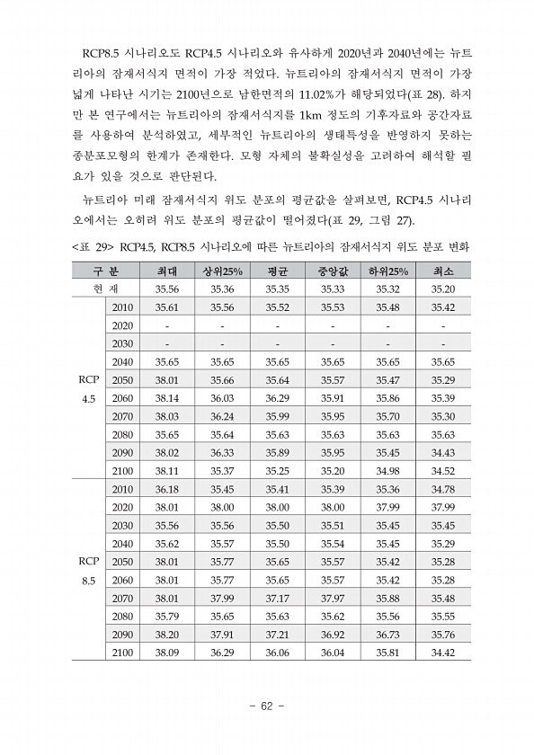 RCP8.5 ? RCP4.5 ? 2020 2040 ? ? ?2100 ? 11.02% 28 1km ? , ? , RCP4.5 ? ? 29, ? 27 25% ? 25% 35.56 35.36 35.35 35.33 35.32 35.20 RCP 4.5 2010 35.61 35.56 35.52 35.53 35.48 35.42 2020 2030 2040 35.65 35.65 35.65 35.65 35.65 35.65 2050 38.01 35.66 35.64 35.57 35.47 35.29 2060 38.14 36.03 36.29 35.91 35.86 35.39 2070 38.03 36.24 35.99 35.95 35.70 35.30 2080 35.65 35.64 35.63 35.63 35.63 35.63 2090 38....