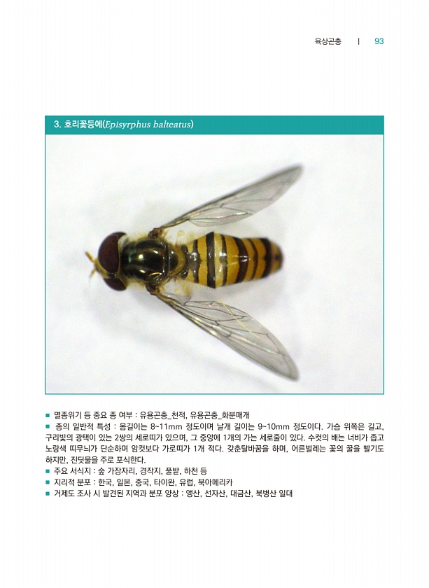 육상곤충 ┃ 93 3. 호리꽃등에 Episyrphus balteatus ■ 멸종위기 등 중요 종 여부 유용곤충_천적, 유용곤충_화분매개 ■ 종의 일반적 특성 몸길이는 811mm 정도이며 날개 길이는 910mm 정도이다. 가슴 위쪽은 길고, 구리빛의 광택이 있는 2쌍의 세로띠가 있으며, 그 중앙에 1개의 가는 세로줄이 있다. 수컷의 배는 너비가 좁고 노랑색 띠무늬가 단순하며 암컷보다 가로띠가 1개 적다. 갖춘탈바꿈을 하며, 어른벌레는 꽃의 꿀을 빨기도 하지만, 진딧물을 주로 포식한다. ■ 주요 서식지 숲 가장자리, 경작지, 풀밭, 하천 등 ■ 지리적 분포 한국, 일본, 중국, 타이완, 유럽, 북아메리카 ■ 거제도 조사 시 발견된 지역과 분포 양상 앵산, 선자산, 대금산, 북병산일대