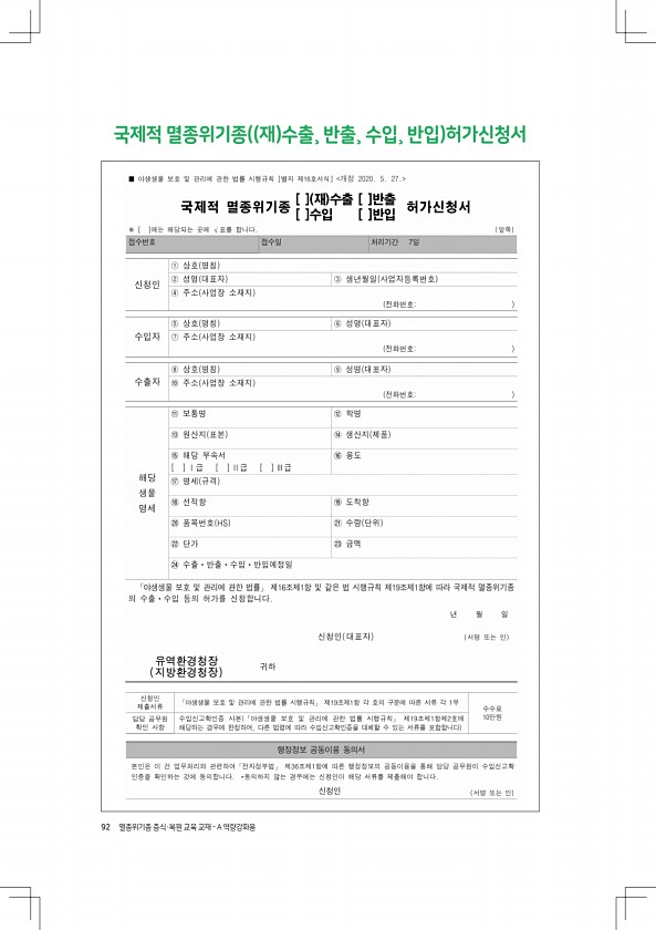 92 멸종위기종 증식·복원 교육 교재 A 역량강화용 국제적 멸종위기종 재 수출¸ 반출¸ 수입¸ 반입허가신청서