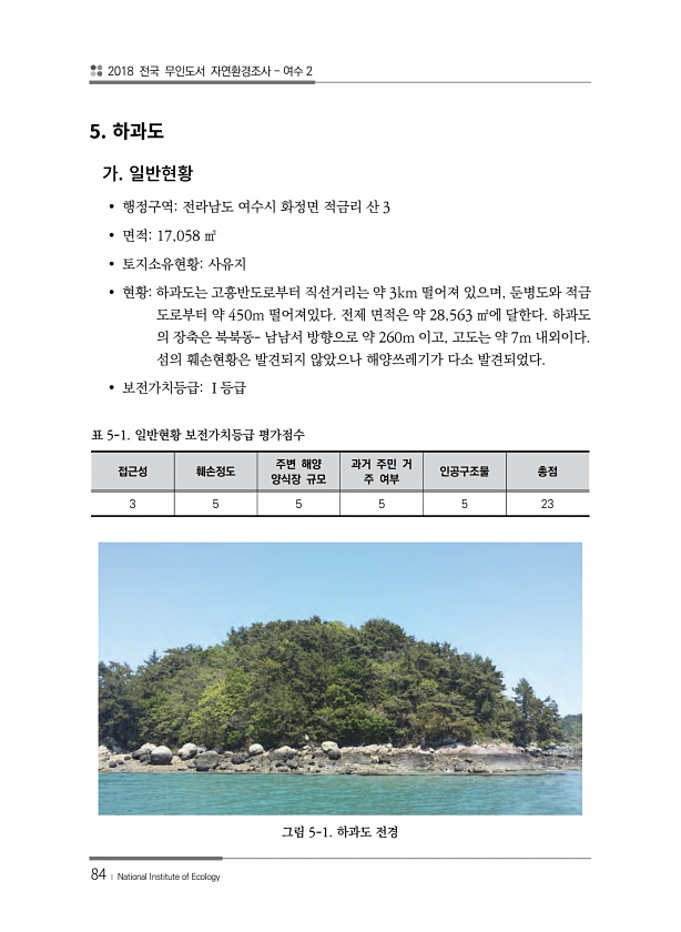 2018 전국 무인도서 자연환경조사 여수 2 84 ? National Institute of Ecology 5. ? 행정구역전라남도 여수시 화정면 적금리 산 3 ? 면적17,058 ㎡ ? 토지소유현황사유지 ? 현황하과도는 고흥반도로부터 직선거리는 약 3km 떨어져 있으며, 둔병도와 적금 도로부터 약 450m 떨어져있다. 전제 면적은 약 28,563 ㎡에 달한다. 하과도 의 장축은 북북동- 남남서 방향으로 약 260m 이고, 고도는 약 7m 내외이다. 섬의 훼손현황은 발견되지 않았으나 해양쓰레기가 다소 발견되었다. ? 보전가치등급Ⅰ등급 접근성 훼손정도 주변 해양 양식장 규모 과거 주민 거 주 여부 인공구조물 총점 3 5 5 5 5 23 표 5-1. 일반현황 보전가치등급 평가점수 그림 5-1. 하과도전경