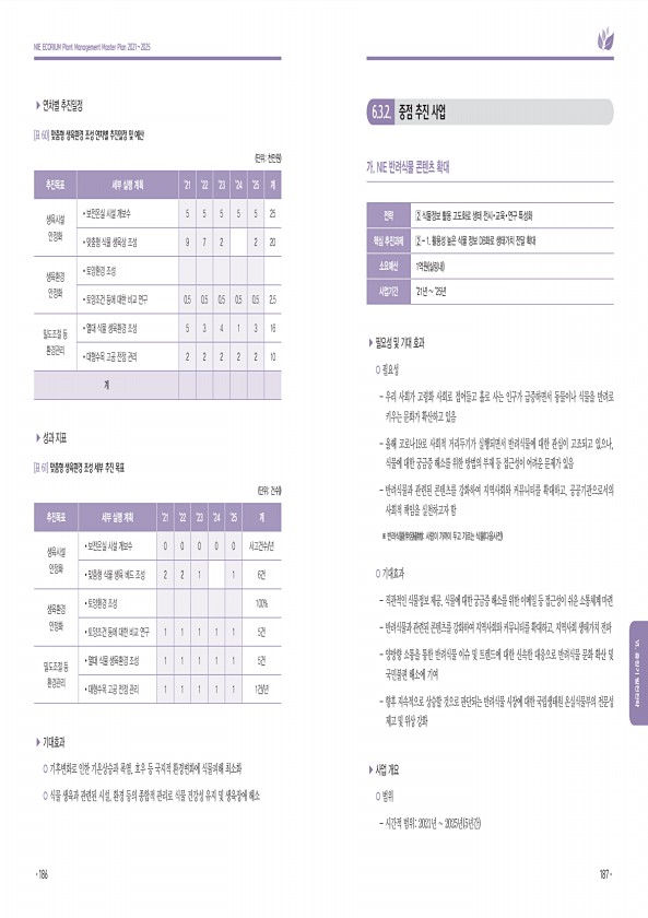 6.3.2. 중점 추진 사업 가. NIE 반려식물 콘텐츠 확대 전략 ? 식물정보 활용 고도화로 생태 전시?교육?연구 특성화 핵심 추진과제 ? 1. 활용성 높은 식물 정보 DB화로 생태가치 전달 확대 소요예산 1억원 실링내 사업기간 ‘21년 ‘25년 ▶ 필요성 및 기대 효과 ?? 필요성 우리 사회가 고령화 사회로 접어들고 홀로 사는 인구가 급증하면서 동물이나 식물을 반려로 키우는 문화가 확산하고 있음 올해 코로나19로 사회적 거리두기가 실행되면서 반려식물에 대한 관심이 고조되고 있으나, 식물에 대한 궁금증 해소를 위한 방법의 부재 등 접근성이 어려운 문제가 있음 반려식물과 관련된 콘텐츠를 강화하여 지역사회와 커뮤니티를 확대하고, 공공기관으로서의 사회적 책임을 실천하고자 함 ※ 반려식물 伴侶植物 사람이 가까이 ...