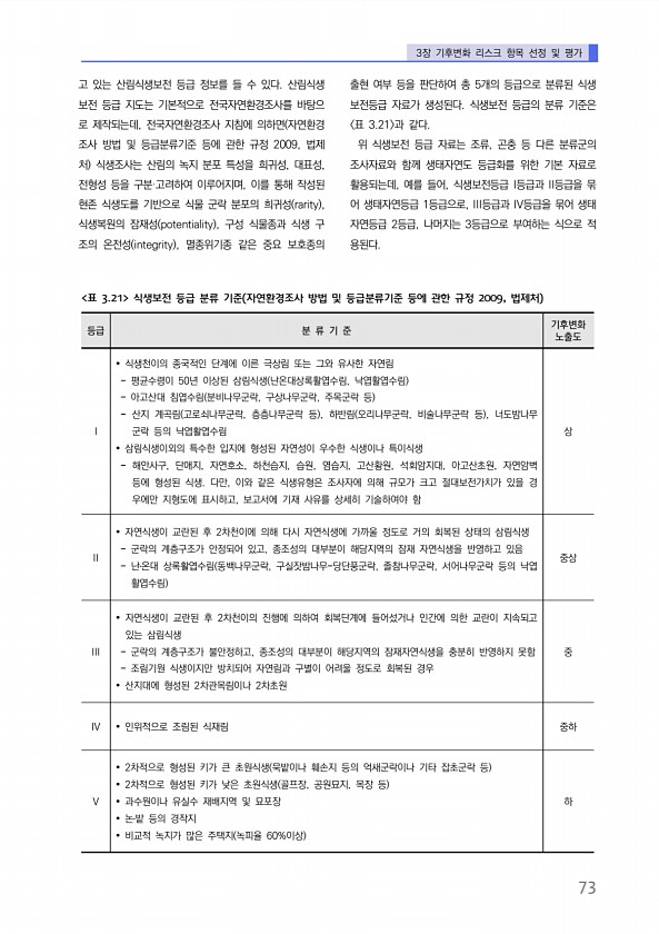 3장 기후변화 리스크 항목 선정 및 평가 73 고 있는 산림식생보전 등급 정보를 들 수 있다. 산림식생 보전 등급 지도는 기본적으로 전국자연환경조사를 바탕으 로 제작되는데, 전국자연환경조사 지침에 의하면 자연환경 조사 방법 및 등급분류기준 등에 관한 규정 2009, 법제 처 식생조사는 산림의 녹지 분포 특성을 희귀성, 대표성, 전형성 등을 구분·고려하여 이루어지며, 이를 통해 작성된 현존 식생도를 기반으로 식물 군락 분포의 희귀성 rarity , 식생복원의 잠재성 potentiality , 구성 식물종과 식생 구 조의 온전성 integrity , 멸종위기종 같은 중요 보호종의 출현 여부 등을 판단하여 총 5개의 등급으로 분류된 식생 보전등급 자료가 생성된다. 식생보전 등급의 분류 기준은 표 3.21 과 같다...