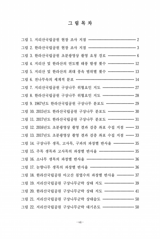 그 림 목 차 그림 1. 지리산국립공원 현장 조사 지점 ·····················································2 그림 2. 한라산국립공원 현장 조사 지점 ·····················································3 그림 3. 한라산국립공원 초분광영상 촬영 요청 경로 ·······························6 그림 4. 지리산 및 한라산의 연도별 태풍 발생 횟수 ·····························12 그림 5. 지리산 및 한라산의 최대 풍속 범위별 횟수 ·····························13 그림 6. 전나무속의 세계적 분포 ·······························...