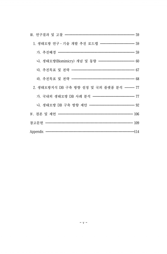 v Ⅲ. 연구결과 및 고찰 ··················································································59 1. 생태모방 연구·기술 개발 추진 로드맵 ········································59 가. 추진배경 ··························································································59 나. 생태모방 Biomimicry 개념 및 동향 ··········································60 다. 추진목표 및 전략 ···············································...