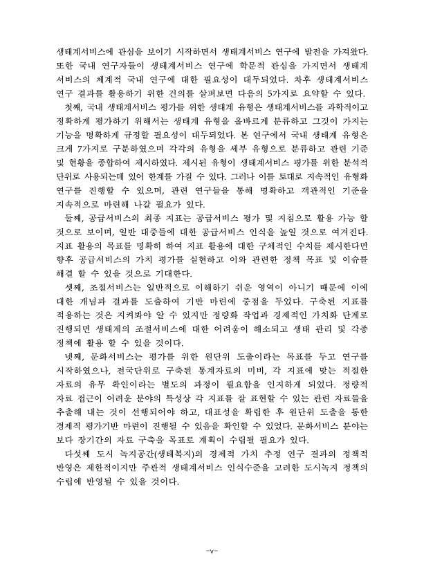-v- 생태계서비스에 관심을 보이기 시작하면서 생태계서비스 연구에 발전을 가져왔다 또한 국내 연구자들이 생태계서비스 연구에 학문적 관심을 가지면서 생태계 서비스의 체계적 국내 연구에 대한 필요성이 대두되었다 차후 생태계서비스 연구 결과를 활용하기 위한 건의를 살펴보면 다음의 가지로 요약할 수 있다 첫째 국내 생태계서비스 평가를 위한 생태계 유형은 생태계서비스를 과학적이고 정확하게 평가하기 위해서는 생태계 유형을 올바르게 분류하고 그것이 가지는 기능을 명확하게 규정할 필요성이 대두되었다 본 연구에서 국내 생태계 유형은 크게 가지로 구분하였으며 각각의 유형을 세부 유형으로 분류하고 관련 기준 및 현황을 종합하여 제시하였다 제시된 유형이 생태계서비스 평가를 위한 분석적 단위로 사용되는데 있어 한계를 가질 수 있다...