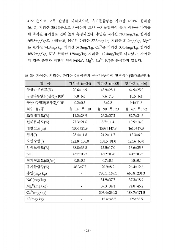 78 4.22 순으로 모두 산성을 나타냈으며, 유기물함량은 가야산 46.3%, 한라산 26.4%, 지리산 20.9%순으로 가야산의 토양 유기물함량이 높은 이유는 바위틈 에 축적된 유기물로 인해 높게 측정되었다. 총인은 지리산 780.1mg/kg, 한라산 665.8mg/kg로 나타났고, Na+은 한라산 37.3mg/kg, 지리산 31.9mg/kg, Mg2+ 은 한라산 74.8mg/kg, 지리산 57.3mg/kg, Ca2+은 지리산 306.4mg/kg, 한라산 188.7mg/kg, K+은 한라산 128mg/kg, 지리산 112.4mg/kg로 나타났다. 가야산 의 경우 총인과 치환성 양이온 Na+, Mg2+, Ca2+, K+ 은 분석하지 않았다. 항 목 가야산?24 지리산?83 한라산?66 구상나무피도 % 20....