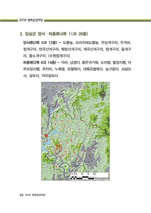 94 2018 생태공감마당 3. 임실군 양서·파충류 4목 11과 26종 양서류 2목 5과 12종 도롱뇽, 꼬리치레도롱뇽, 무당개구리, 두꺼비, 청개구리, 한국산개구리, 북방산개구리, 계곡산개구리, 참개구리, 옴개구 리, 황소개구리, 수원청개구리 파충류 2목 6과 14종 자라, 남생이, 붉은귀거북, 도마뱀, 줄장지뱀, 아 무르장지뱀, 무자치, 누룩뱀, 유혈목이, 대륙유혈목이, 능구렁이, 쇠살모 사, 살모사,까치살모사