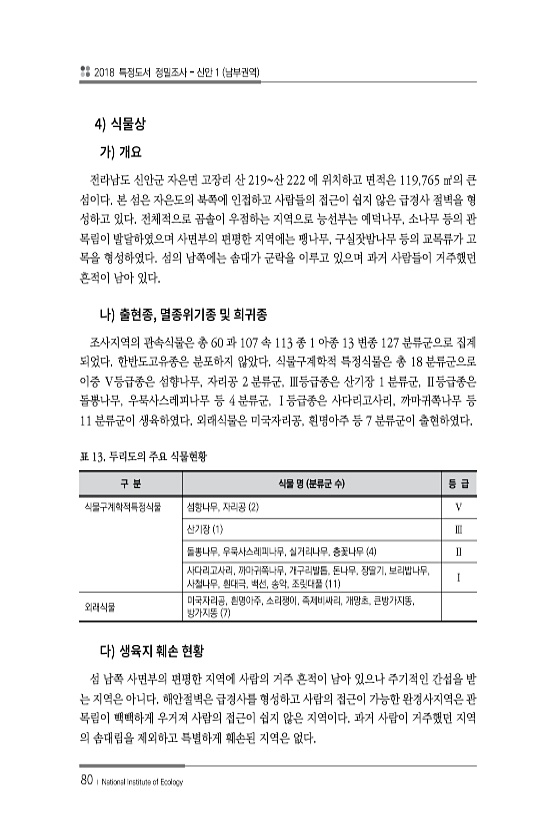 2018 특정도서 정밀조사 신안 1 남부권역 80 ? National Institute of Ecology 4 전라남도 신안군 자은면 고장리 산 219산 222 에 위치하고 면적은 119,765 ㎡의 큰 섬이다. 본 섬은 자은도의 북쪽에 인접하고 사람들의 접근이 쉽지 않은 급경사 절벽을 형 성하고 있다. 전체적으로 곰솔이 우점하는 지역으로 능선부는 예덕나무, 소나무 등의 관 목림이 발달하였으며 사면부의 편평한 지역에는 팽나무, 구실잣밤나무 등의 교목류가 고 목을 형성하였다. 섬의 남쪽에는 솜대가 군락을 이루고 있으며 과거 사람들이 거주했던 흔적이 남아 있다. , 조사지역의 관속식물은 총 60 과 107 속 113 종 1 아종 13 변종 127 분류군으로 집계 되었다. 한반도고유종은 분포하지 않았다. 식물구계...