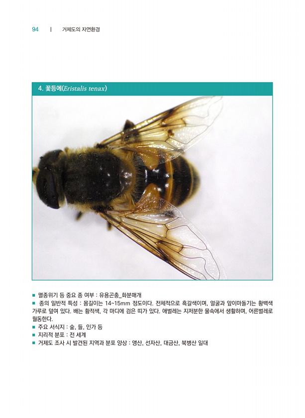 94 ┃ 거제도의 자연환경 4. 꽃등에 Eristalis tenax ■ 멸종위기 등 중요 종 여부 유용곤충_화분매개 ■ 종의 일반적 특성 몸길이는 1415mm 정도이다. 전체적으로 흑갈색이며, 얼굴과 앞이마돌기는 황백색 가루로 덮여 있다. 배는 황적색, 각 마디에 검은 띠가 있다. 애벌레는 지저분한 물속에서 생활하며, 어른벌레로 월동한다. ■ 주요 서식지 숲, 들, 인가 등 ■ 지리적 분포 전 세계 ■ 거제도 조사 시 발견된 지역과 분포 양상 앵산, 선자산, 대금산, 북병산일대