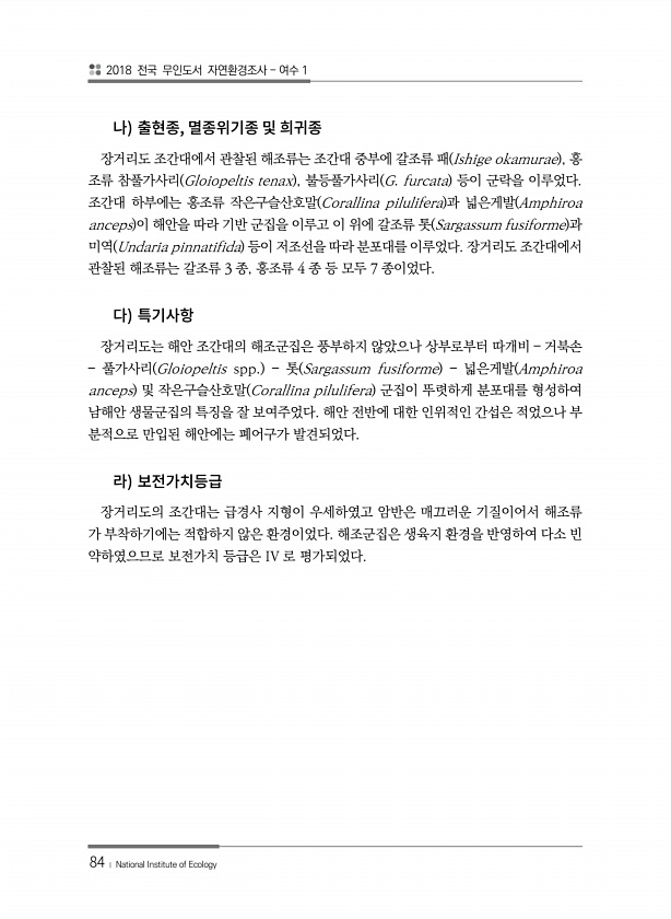 2018 전국 무인도서 자연환경조사 여수 1 84 ? National Institute of Ecology , 장거리도 조간대에서 관찰된 해조류는 조간대 중부에 갈조류 패 Ishige okamurae , 홍 조류 참풀가사리 Gloiopeltis tenax , 불등풀가사리 G. furcata 등이 군락을 이루었다. 조간대 하부에는 홍조류 작은구슬산호말 Corallina pilulifera 과 넓은게발 Amphiroa anceps 이 해안을 따라 기반 군집을 이루고 이 위에 갈조류 톳 Sargassum fusiforme 과 미역 Undaria pinnatifida 등이 저조선을 따라 분포대를 이루었다. 장거리도 조간대에서 관찰된 해조류는 갈조류 3 종, 홍조류 4 종 등 모두 7 종이었다. 장거리도는 해안 조간...