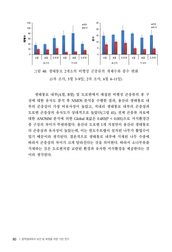 80 그림 40. 생태통로 2개소의 비행성 곤충류의 개체수와 종수 변화 1차 조사, 5월 39일; 2차 조사, 6월 611일 생태통로 내부 열 열 및 도로변에서 채집된 비행성 곤충류의 종 구 성에 대한 유사도 분석 후 분석을 수행한 결과 용산리 생태통로 내 부의 곤충상이 가장 비유사성이 높았고 지내리 생태통로 내부의 곤충상과 도로변 곤충상의 유사도가 상대적으로 높았다 그림 전체 곤충류 자료에 대한 분석에 의한 값은 으로 서식환경간 종 구성의 차이가 뚜렷하였다 용산리 도로변 개 지점만이 용산리 생태통로 의 곤충상과 유사성이 높았는데 이는 윈도우트랩이 설치된 나무가 활엽수이 었기 때문이라 생각된다 결론적으로 생태통로 내부에 식재된 나무 수종에 따라서 곤충상의 차이가 크게 달라진다는 것을 의미한다 따라서 소나무류...