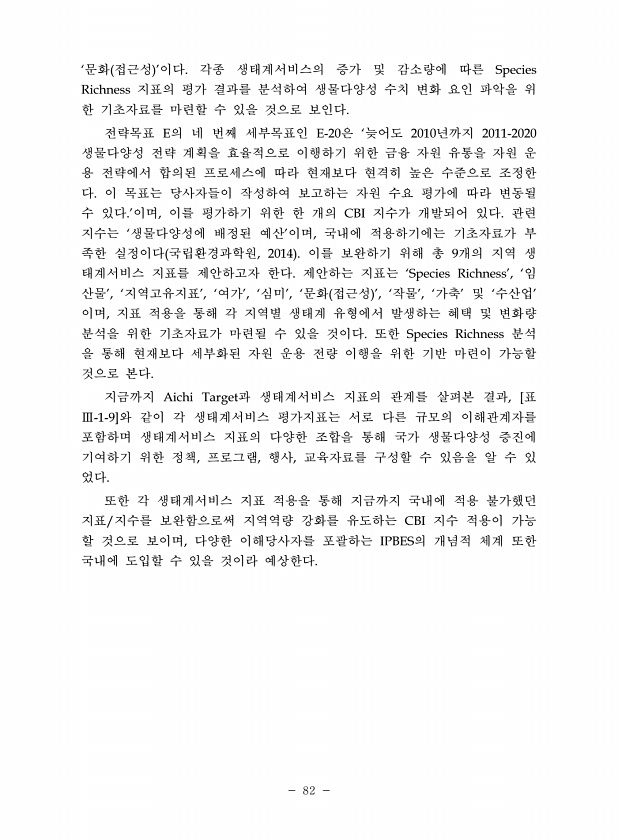 82 ‘문화 접근성 ’이다. 각종 생태계서비스의 증가 및 감소량에 따른 Species Richness 지표의 평가 결과를 분석하여 생물다양성 수치 변화 요인 파악을 위 한 기초자료를 마련할 수 있을 것으로 보인다. 전략목표 E의 네 번째 세부목표인 E-20은 ‘늦어도 2010년까지 2011-2020 생물다양성 전략 계획을 효율적으로 이행하기 위한 금융 자원 유통을 자원 운 용 전략에서 합의된 프로세스에 따라 현재보다 현격히 높은 수준으로 조정한 다. 이 목표는 당사자들이 작성하여 보고하는 자원 수요 평가에 따라 변동될 수 있다.’이며, 이를 평가하기 위한 한 개의 CBI 지수가 개발되어 있다. 관련 지수는 ‘생물다양성에 배정된 예산’이며, 국내에 적용하기에는 기초자료가 부 족한 실정이다 국립환경과학원, 20...