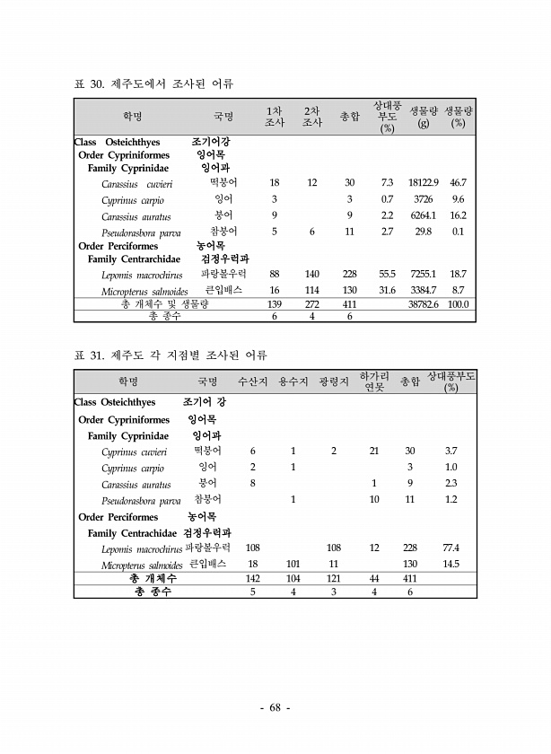 68 학명 국명 1차 조사 2차 조사 총합 상대풍 부도 % 생물량 g 생물량 % Class Osteichthyes 조기어강 Order Cypriniformes 잉어목 Family Cyprinidae 잉어과 Carassius cuvieri 떡붕어 18 12 30 7.3 18122.9 46.7 Cyprinus carpio 잉어 3 3 0.7 3726 9.6 Carassius auratus 붕어 9 9 2.2 6264.1 16.2 Pseudorasbora parva 참붕어 5 6 11 2.7 29.8 0.1 Order Perciformes 농어목 Family Centrarchidae 검정우럭과 Lepomis macrochirus 파랑볼우럭 88 140 228 55.5 7255.1 18.7 Micropterus s...