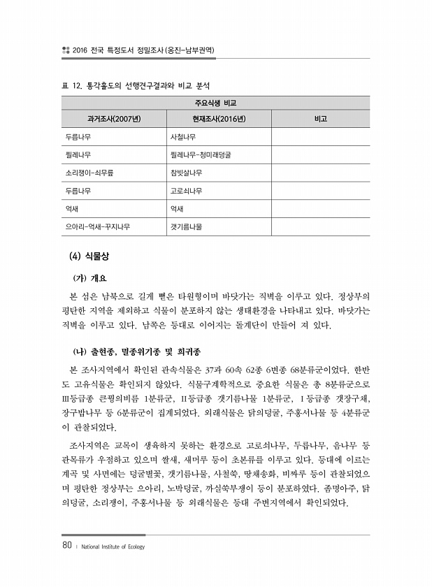 2016 전국 특정도서 정밀조사 옹진-남부권역 80 ? National Institute of Ecology 주요식생 비교 과거조사 2007년 현재조사 2016년 비고 두릅나무 사철나무 찔레나무 찔레나무-청미래덩굴 소리쟁이-쇠무릎 참빗살나무 두릅나무 고로쇠나무 억새 억새 으아리-억새-꾸지나무 갯기름나물 표 12. 통각흘도의 선행견구결과와 비교 분석 4 식물상 가 개요 본 섬은 남북으로 길게 뻗은 타원형이며 바닷가는 직벽을 이루고 있다. 정상부의 평탄한 지역을 제외하고 식물이 분포하지 않는 생태환경을 나타내고 있다. 바닷가는 직벽을 이루고 있다. 남쪽은 등대로 이어지는 돌계단이 만들어 져 있다. 나 출현종, 멸종위기종 및 희귀종 본 조사지역에서 확인된 관속식물은 37과 60속 62종 6변종 68분류군이었다. ...