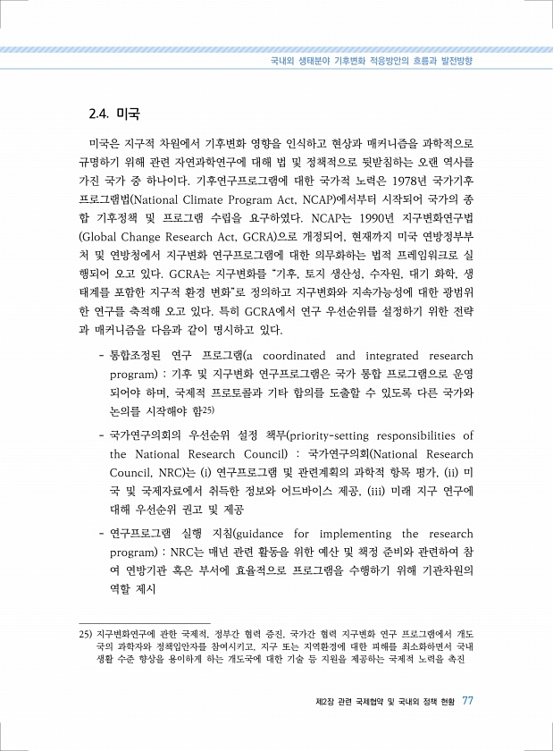 국내외 생태분야 기후변화 적응방안의 흐름과 발전방향 제2장 관련 국제협약 및 국내외 정책 현황 77 2.4. 미국 미국은 지구적 차원에서 기후변화 영향을 인식하고 현상과 매커니즘을 과학적으로 규명하기 위해 관련 자연과학연구에 대해 법 및 정책적으로 뒷받침하는 오랜 역사를 가진 국가 중 하나이다. 기후연구프로그램에 대한 국가적 노력은 1978년 국가기후 프로그램법 National Climate Program Act, NCAP 에서부터 시작되어 국가의 종 합 기후정책 및 프로그램 수립을 요구하였다. NCAP는 1990년 지구변화연구법 Global Change Research Act, GCRA 으로 개정되어, 현재까지 미국 연방정부부 처 및 연방청에서 지구변화 연구프로그램에 대한 의무화하는 법적 프레임워크로 실 ...