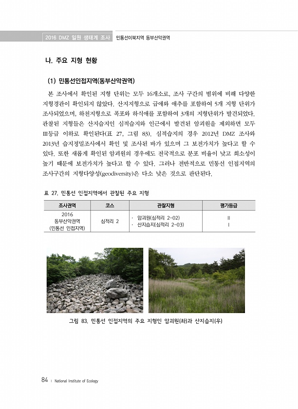 2016 DMZ 일원 생태계 조사 민통선이북지역 동부산악권역 84 ? National Institute of Ecology 나. 주요 지형 현황 1 민통선인접지역 동부산악권역 본 조사에서 확인된 지형 단위는 모두 16개소로, 조사 구간의 범위에 비해 다양한 지형경관이 확인되지 않았다. 산지지형으로 급애와 애추를 포함하여 5개 지형 단위가 조사되었으며, 하천지형으로 폭포와 하식애를 포함하여 3개의 지형단위가 발견되었다. 관찰된 지형들은 산지습지인 심적습지와 인근에서 발견된 암괴원을 제외하면 모두 Ⅲ등급 이하로 확인된다 표 27, 그림 83 심적습지의 경우 2012년 DMZ 조사와 2013년 습지정밀조사에서 확인 및 조사된 바가 있으며 그 보전가치가 높다고 할 수 있다. 또한 새롭게 확인된 암괴원의 경우에도 전...