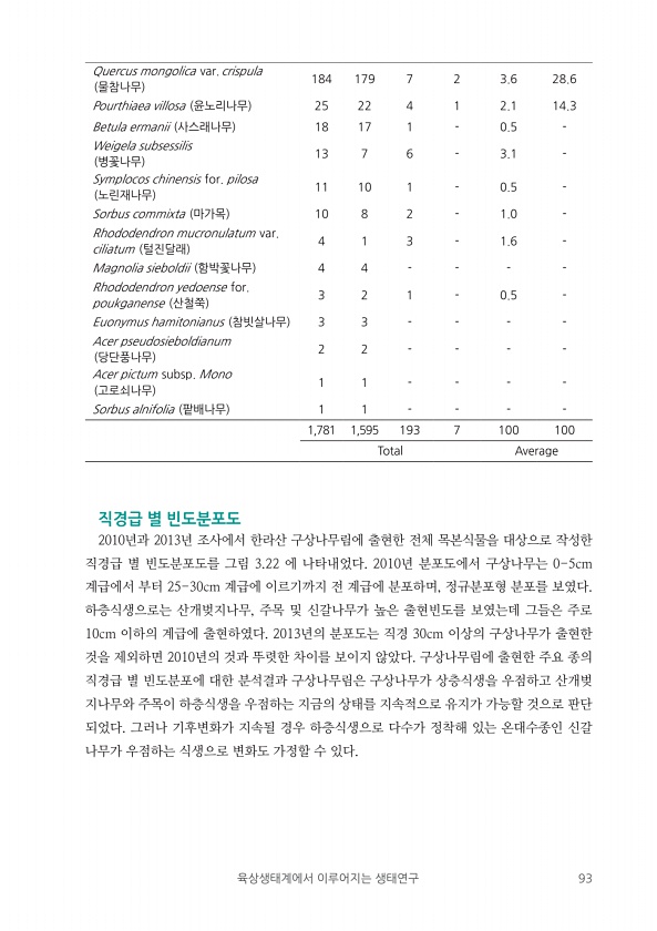 육상생태계에서 이루어지는 생태연구 93 Quercus mongolica var. crispula 물참나무 184 179 7 2 3.6 28.6 Pourthiaea villosa 윤노리나무 25 22 4 1 2.1 14.3 Betula ermanii 사스래나무 18 17 1 0.5 Weigela subsessilis 병꽃나무 13 7 6 3.1 Symplocos chinensis for. pilosa 노린재나무 11 10 1 0.5 Sorbus commixta 마가목 10 8 2 1.0 Rhododendron mucronulatum var. ciliatum 털진달래 4 1 3 1.6 Magnolia sieboldii 함박꽃나무 4 4 Rhododendron yedoense for. poukganense 산철쭉...