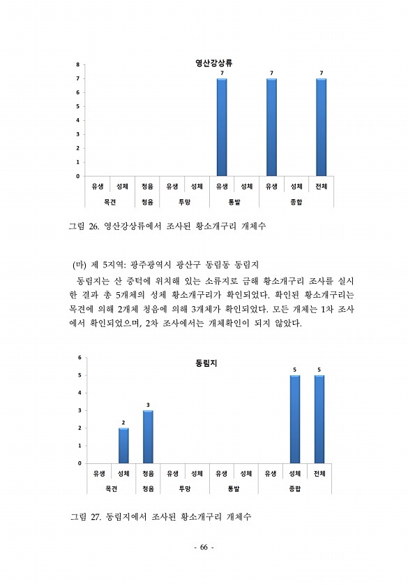 66 그림 26. 영산강상류에서 조사된 황소개구리 개체수 마 제 5지역광주광역시 광산구 동림동 동림지 동림지는 산 중턱에 위치해 있는 소류지로 금해 황소개구리 조사를 실시 한 결과 총 5개체의 성체 황소개구리가 확인되었다. 확인된 황소개구리는 목견에 의해 2개체 청음에 의해 3개체가 확인되었다. 모든 개체는 1차 조사 에서 확인되었으며, 2차 조사에서는 개체확인이 되지 않았다. 그림 27. 동림지에서 조사된 황소개구리개체수