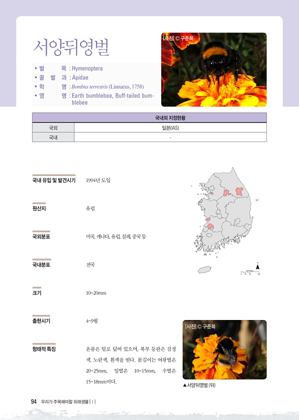 94 우리가 주목해야할 외래생물 [Ⅰ] 국내 유입 및 발견시기 1994년 도입 원산지 유럽 국외분포 미국, 캐나다, 유럽, 칠레, 중국 등 국내분포 전국 크기 1020mm 출현시기 49월 형태적 특징 온몸은 털로 덮여 있으며, 복부 등판은 검정 색, 노란색, 흰색을 띤다. 몸길이는 여왕벌은 2025mm, 일벌은 1015mm, 수벌은 1518mm이다. ? 벌 목 Hymenoptera ? 꿀 벌 과 Apidae ? 학 명 Bombus terrestris Linnaeus, 1758 ? 영 명 Earth bumblebee, Buff-tailed bumblebee 국내외 지정현황 국외 일본 IAS 국내 서양뒤영벌 ▲서양뒤영벌 뒤 [사진] ?구준희